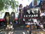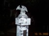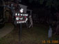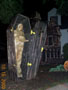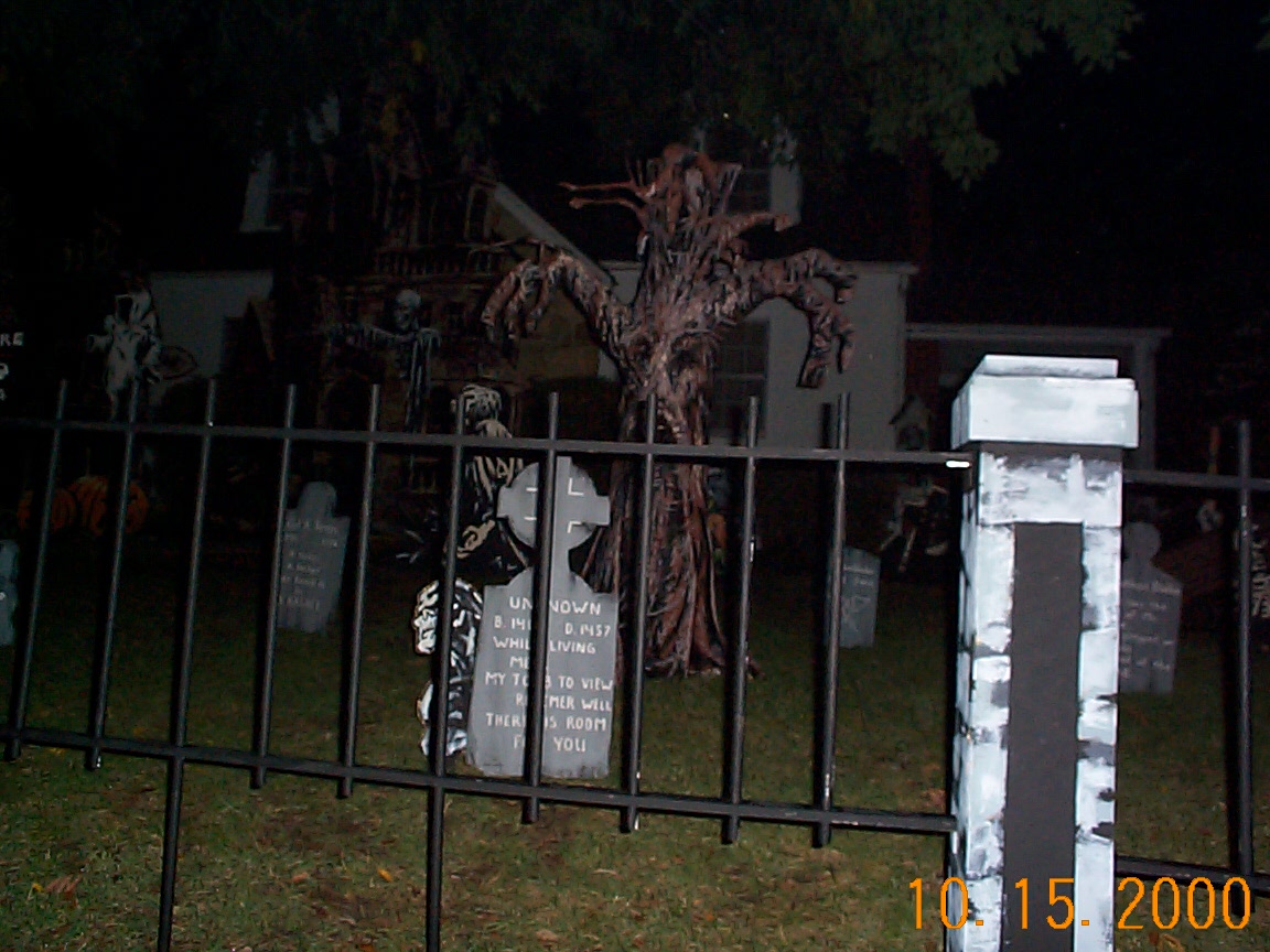 It was a big leap in quality from 1999. I went from a yard of flats painted up 2 dimensionally, to land of 3 dimenson and motion. In 1999 I had the Axworthy flying Ghost as my only "prop in motion". In 2000 I had the Axworthy that worked all the time, plus two Flying Crank Ghosts. Also new were the paper mache skulls that I created and used for most of my new props. The Cemetery Fence added a little class, and tied everything together very nicely. |