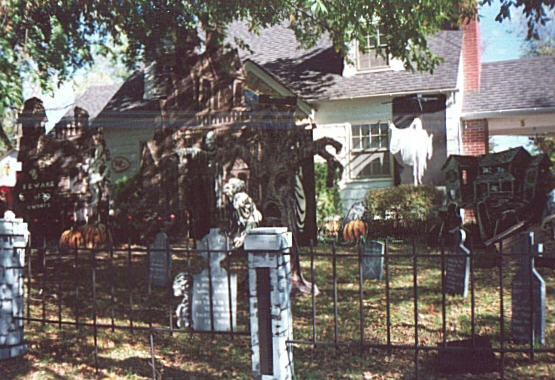VALAAH!! Color! I did not try any night photos of my yard this year because my trusty old SLR has been in the repair shop. This color photo does show a little more detail than the Black and Whites, but you don't get the scary feel. On Halloween I draped the front of my home with black plastic so it was hidden completey. You can see Neenah my FCG much better, and maybe my "Spooky Old Tree", a little better. I think I will put a higher contrasting paint on my tree so that it can be seen better. There is a speaker in the tree, along with in the Mummys coffin, but I saw a Howl2000 member that has speakers inside of rocks that I think I will add this year. This year I am also planning on doing something with the garage area, which is on the left side of the front of the house. It has been neglected in the past because of the cars, but this is Halloween, let's get rid of those cars! I would love to hear your comments on what you see, or what you would like to see. Email me directly, or even better, sign my guestbook and leave your comments there for all to see. Thanks for visiting, and even better, thanks for making it to the end of my rambling script. You have ventured further than many before you. Let's keep Halloween out of the Shopping Malls. If you live in the city, go to the suburbs and Trick or Treat. If you live in the suburbs, it is your responsibility to make Halloween a fun and safe time for kids and adults alike. I hope you do too! Thanks again, Sin-fully yours, Darkpainter |