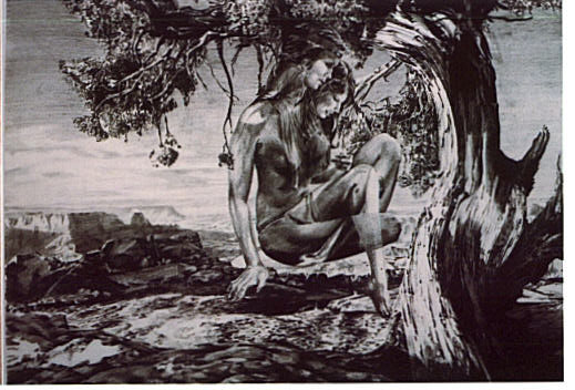"Metamorphically Relevant" Charcol & Pencil on Strathmore paper 18" x 24" Famous old twisted tree overlooking the Grand Canyon taken from of course the "Arizona Highways" magazine, along with a couple friends morphed together. My life drawing instructor, Jean Howard, liked us to walk around the models to new angles. I enjoyed this excercise and liked to create new shapes and forms with body parts. Return |