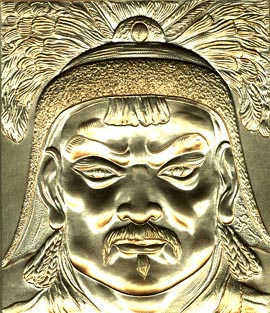 Detail "Ghengis Khan" Hand sculptured embossing. No litho All detail is provided by engraver's embossing die. Hand carved in brass. |